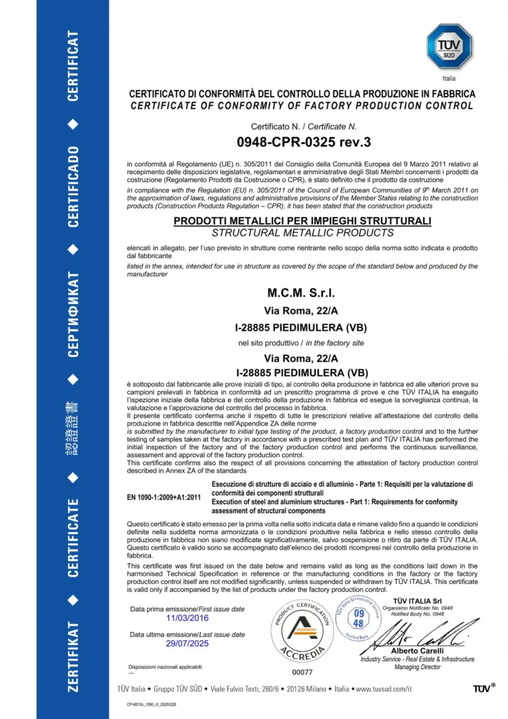 MCM ha conseguito il Certificato di Conformità del Controllo della Produzione in Fabbrica, rilasciato dall’ente TÜV. Questo importante riconoscimento attesta il rigore, l’affidabilità e la qualità costante dei nostri processi produttivi, garantendo prodotti eccellenti per i nostri clienti.